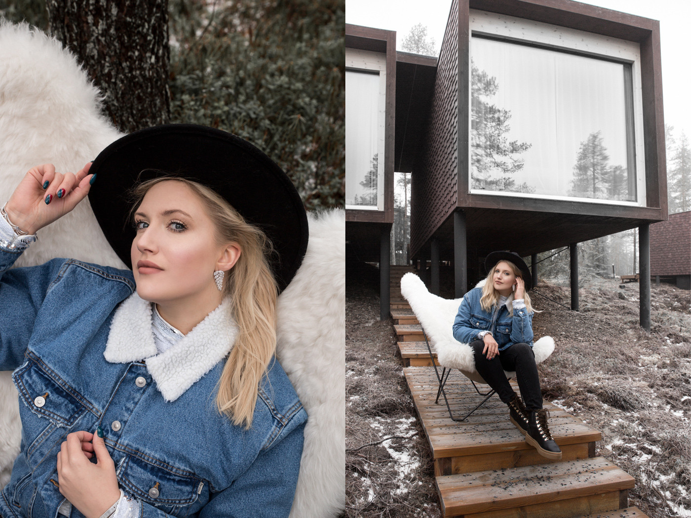 Po szaleństwie w wiosce wróciłyśmy do naszego hotelu. Opublikowałam pierwsze fotki na Instagramie i zasypałyście mnie pytaniami: – Sroki, gdzie jest tak pięknie? Otóż na sesję dla APART wybrałyśmy Tree House Hotel w Rovaniemi. Nie tylko dlatego, że ma Instagramowy widok na szóstkę z plusem. Głównym celem było stworzenie idealnego tła pod kolekcję APART Lśnienie.
